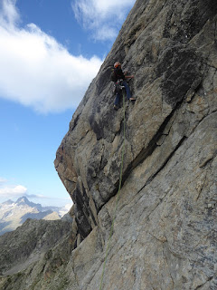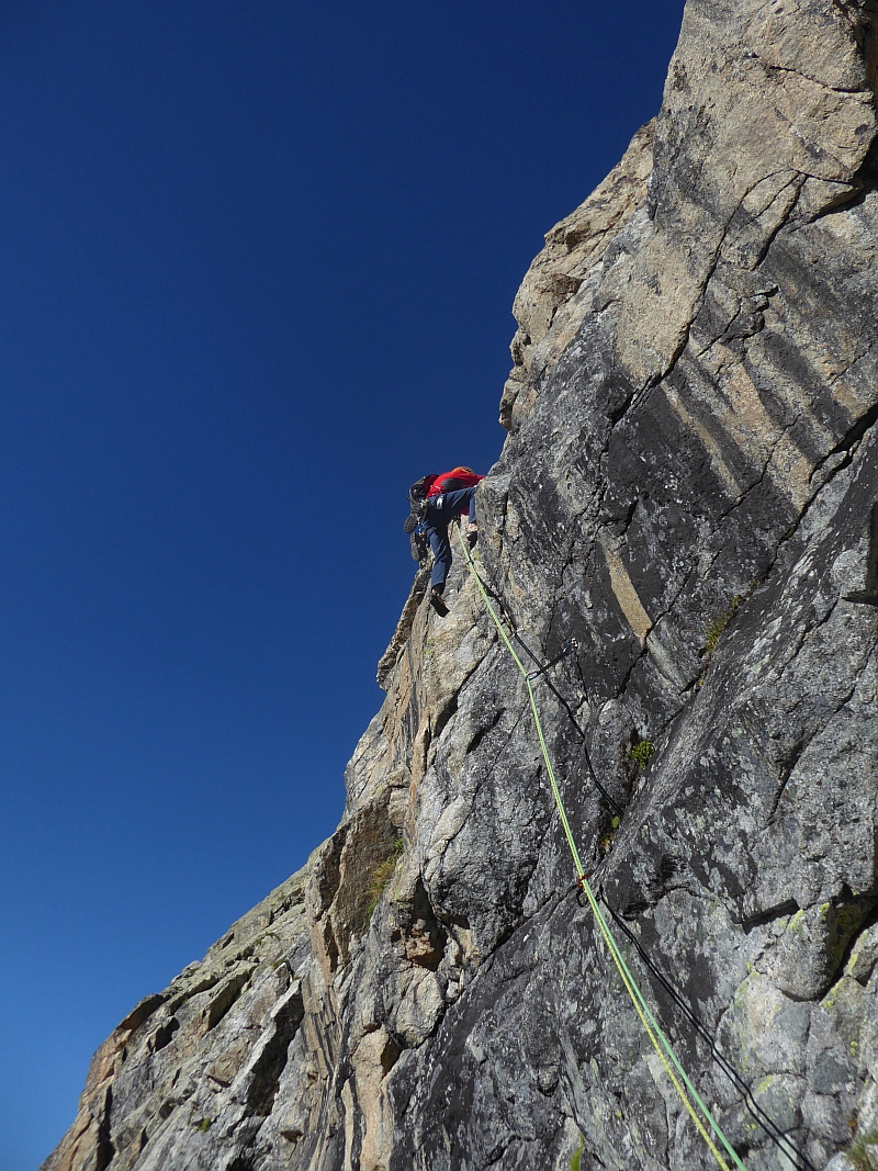 Gaudim del cim i discutim per on continuem. Acabem descartant l'opció d'arribar al Gran Pic i tirem avall. Desgrimpada i rappel de 60 m. Un altre tros de desgrimpada i un segon rappel, aquest de 25 m.