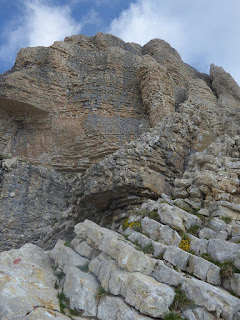 Gairebé saltant de llosa en llosa per aquesta gran graderia arribo al camí inicial i al coll de l'Obiou.